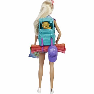 - Take the camping story from day to night with a backpack that opens and closes to store hiking essentials and a colorful sleeping bag that keeps Barbie doll and puppy cozy at night.