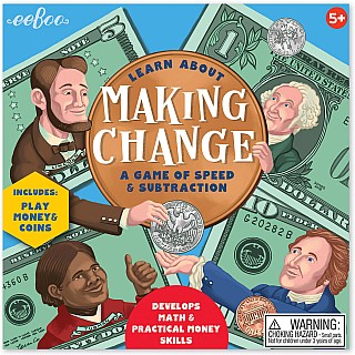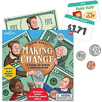 Time for Change! To Play this game you'll use your brain! How's it played? Let us explain: Subtract the price from what was paid... Your answer is the change that's made! Count it out in coins and bills... Have lots of fun while building skills! Making Change is an educational game where players use mental math to subtract the price of an item from the amount paid to make the correct change. Whoever collects the most items wins, get one item from each of 10 categories for bonus points. Making Change helps to build practical math skills. Features: For ages 5 and up Box: 9" x 2" x 9" Play paper money and coins 50 Item cards Watch our video to how to play!