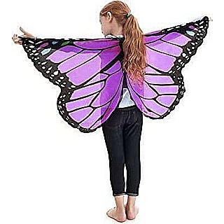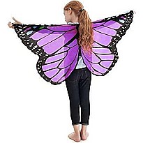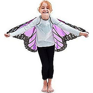 Purple Monarch Butterfly wings in gauzy chiffon with colorful sparkly prints. Soft elastic shoulder straps and finger loops come on and off with ease. Perfect for dress-up, play and dace! An amazing gift for any little girl or boy! Available in 2 sizes.