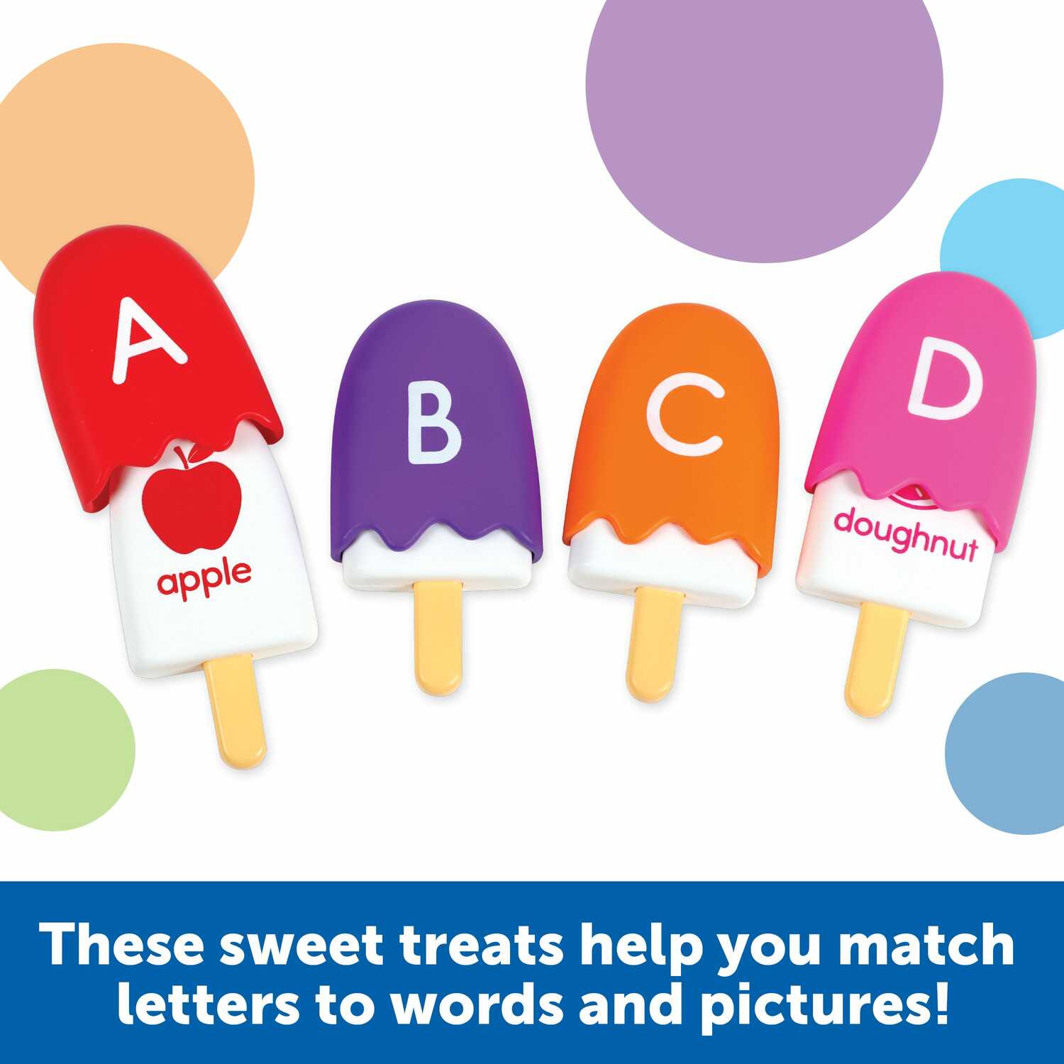 A miniature take on Learning Resources' popular learning pops! This set of 26 matching ice pops comes with a fun surprise- after learning uppercase letters on the outside, pop off the ice pop coating to reveal an illustrated vocabulary word underneath!