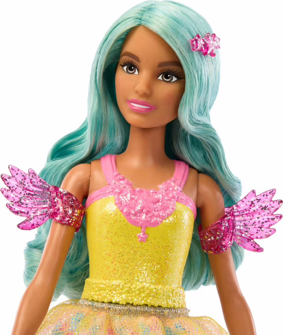 1 Barbie® doll wearing dress and wing accessories, 1 pet with wings and 1 comb. Dolls cannot stand alone. Colors and decorations may vary.