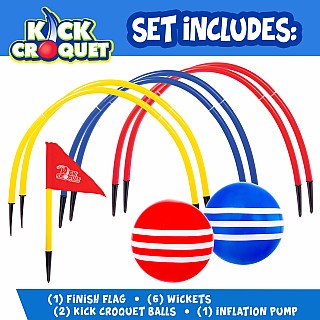 - KICK CROQUET features (6) Croquet Wickets, (1) Finish Flag, (2) 12-inch Kick Croquet Balls