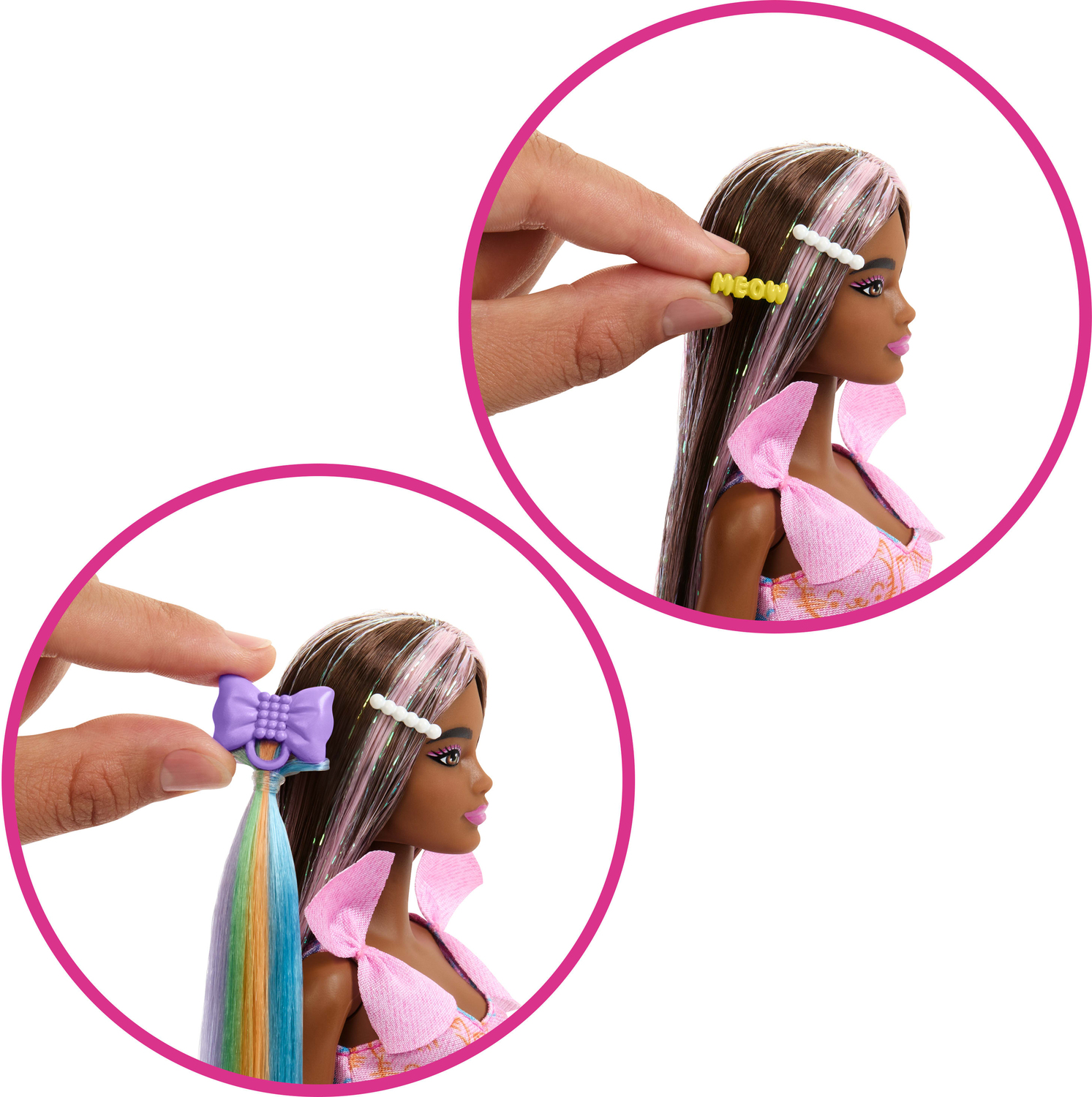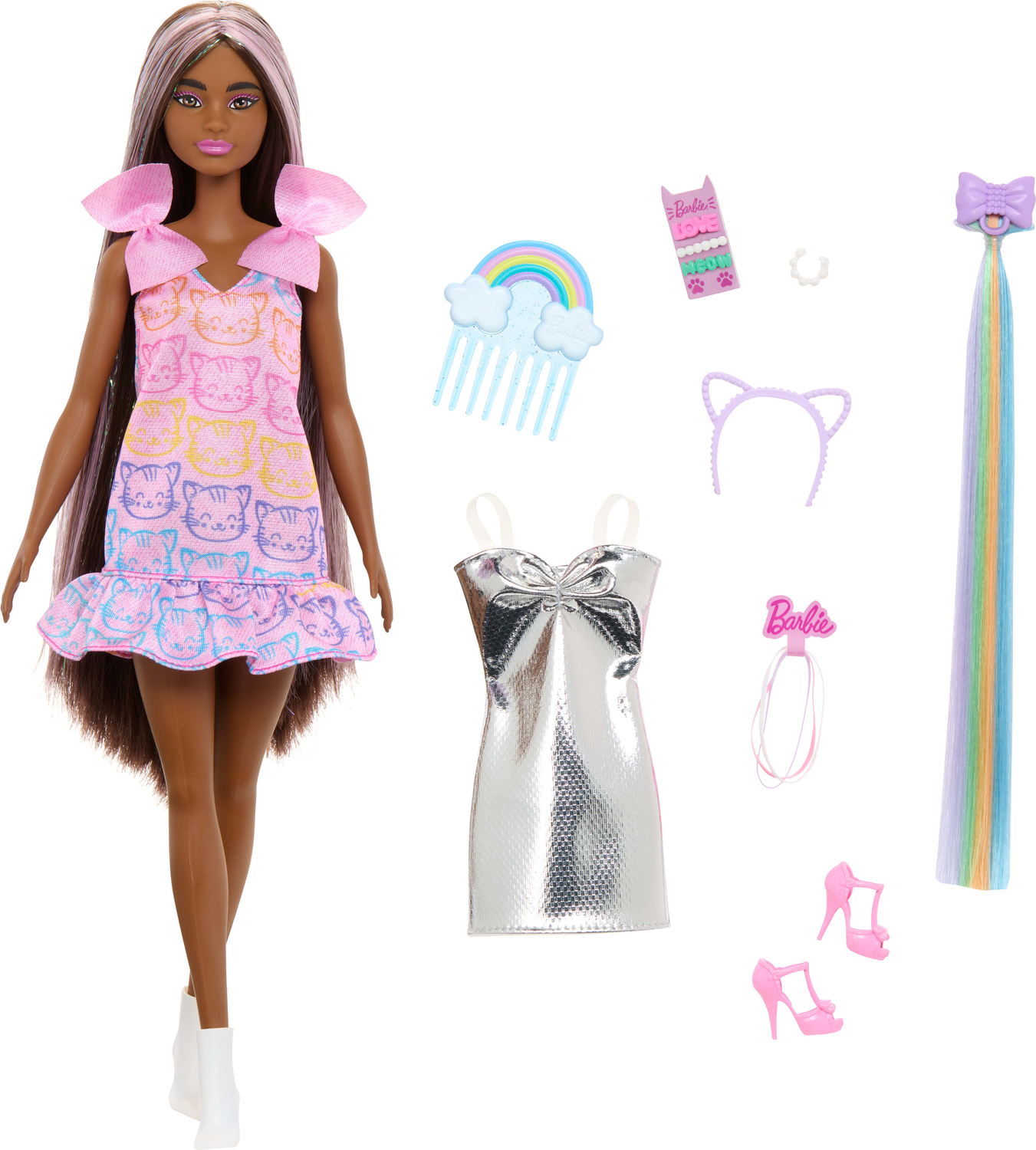 - Styling accessories include a clip with rainbow hair extension, cat ear headband, set of hair ties and one set of hair clips!