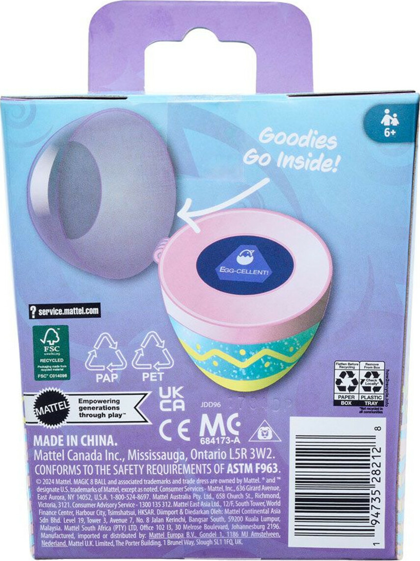 This mysterious and all-knowing egg-shaped Magic 8 Ball is the perfect Easter surprise. Just think of a simple "yes" or "no" question, then turn the Magic 8 Ball Easter Egg over and open the bottom to reveal Easter-themed answers like "Eggcitedly YES." There's also a secret compartment that can hide a mystically sweet holiday treat (not included). Makes a great gift for novelty toy lovers ages 6 years old and up. Colors and decorations may vary! Doll cannot stand alone. Colors and decorations may vary.