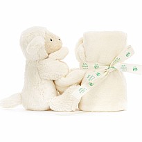 Sweet, gentle Bashful Lamb Soother is a perfect newborn gift, rolled up and presented in a Baby Jellycat grosgrain ribbon. Featuring Jellycat's most loved farmyard friend, soft in a vanilla cream fur made from recycled fibers and holding on tight to a smooth, un-stuffed square shaped soother; a simply gorgeous cuddle companion.