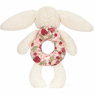 A treat for tiny hands, Blossom Cream Bunny ‘Berry’ Ring Rattle can be grabbed by its soft paws, long lop ears or ring-shaped tummy. When given a gentle shake it will sound the rattle inside, much to baby’s delight! Crafted in a cream colored fur made from recycled fibers with a strawberry patterned tummy in an original Jellycat design, featuring a Bashful Bunny pink suedette nose and embroidery eyes.