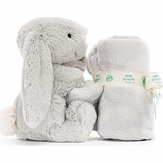 A perfect gift for newborns, the Bashful Bunny Soother is Jellycat's most loved Bashful Bunny in a soft fur, with long lopped ears, a pink suedette nose and stitched eye detail holding a square shaped soother, un-stuffed and irresistibly soft to touch. Made from recycled fibers and neatly rolled up and presented with a Baby Jellycat grosgrain ribbon.