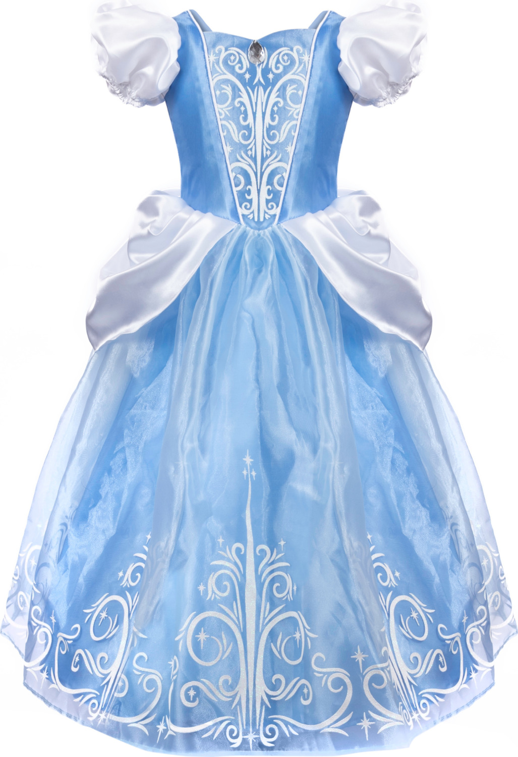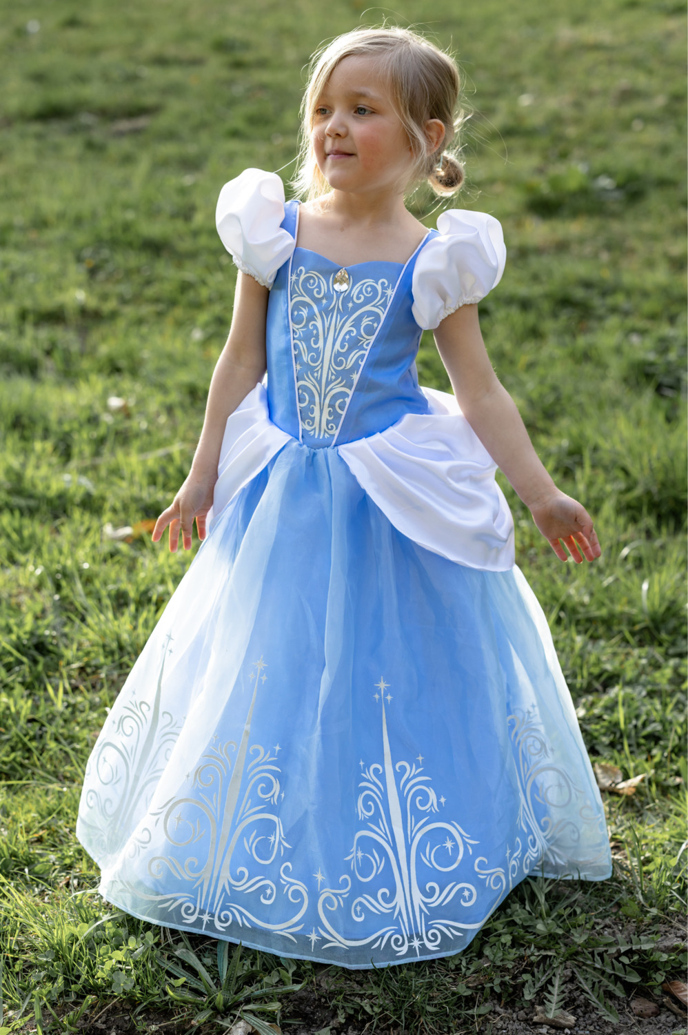 Bring the magic of the ballroom to life with the Once Upon a Princess Glass Slipper Dress. Crafted with soft blue fabric and dreamy white accents, this gown is fit for royalty. Puffy white sleeves add a classic touch, while elegant white draping on each hip flows like a true princess's gown. Intricate swirling designs decorate the bodice and skirt hem, and a sparkling silver jewel at the neckline completes the enchanting look.