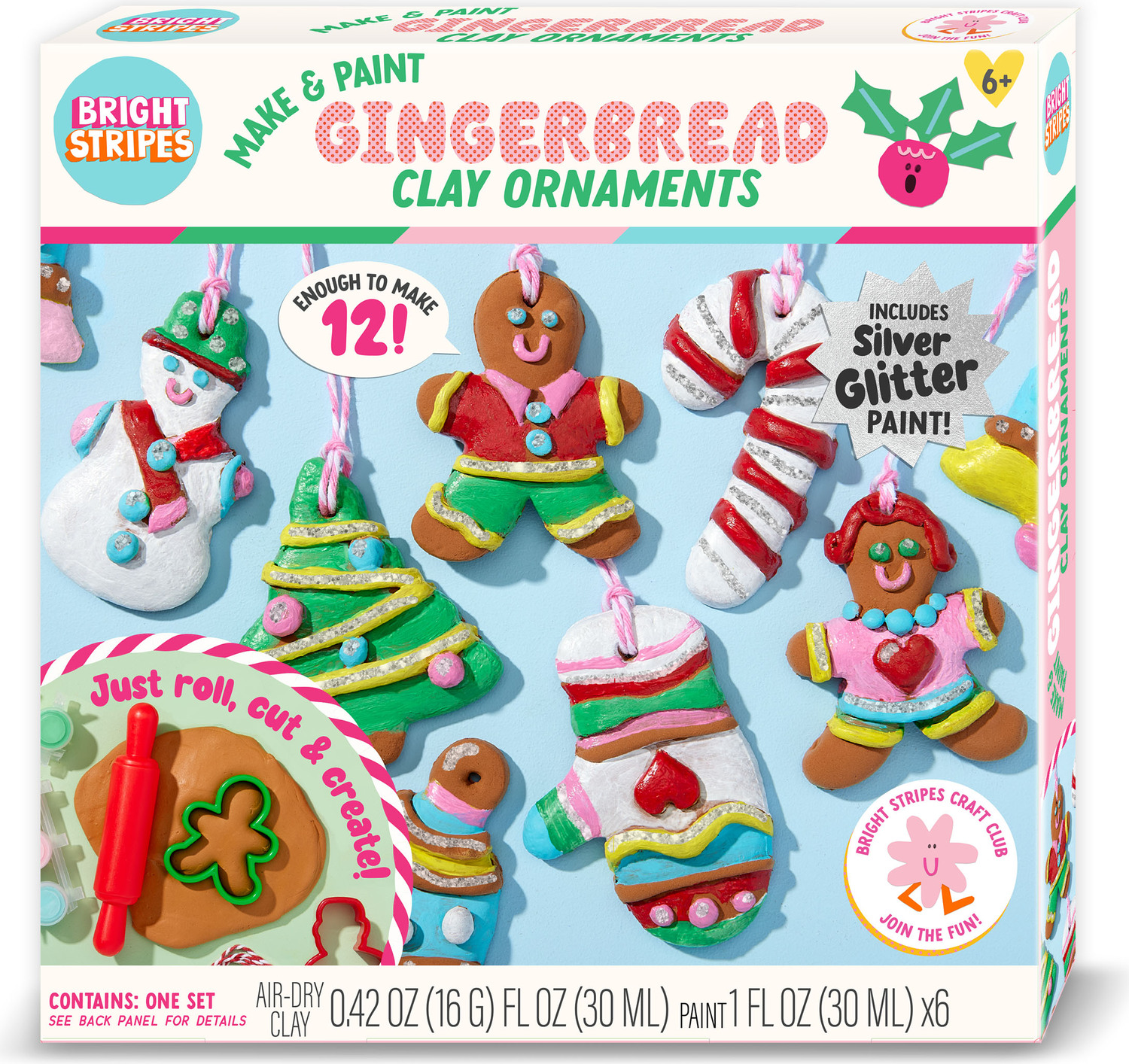 The shapes dry in an hour and are ready to be painted. Set comes with 6 cookie cutters, air-dry clay, rolling pin, 6 paints including glittery silver, and baker's twine! Enough to make 12 ornaments.