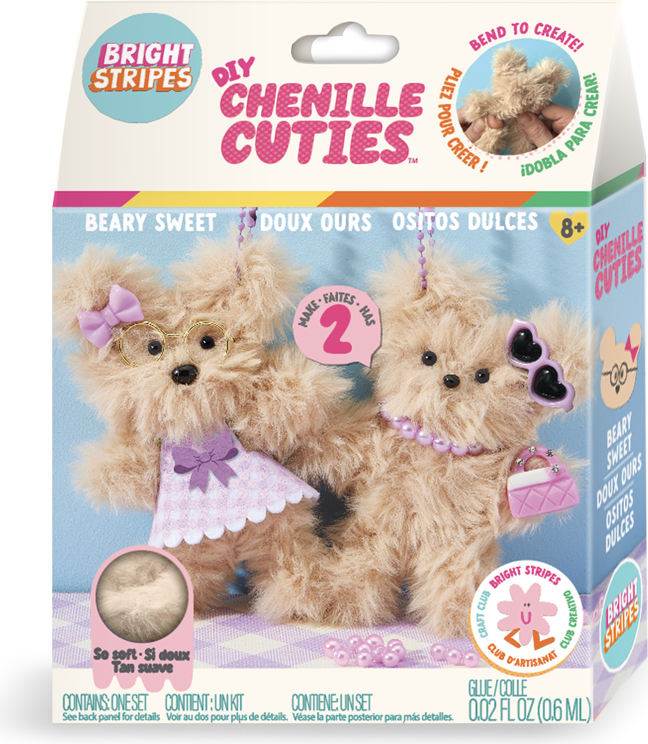 Turn extra-fluffy pipe cleaners into a super sweet pair of bears! Tiny accessories like glasses, bows, and a printed apron give your pair extra cuteness. Make 2 bag danglers in each set! So fun to bend into shape and add accessories! Glue, charms, face features and ball-chain keychains included.