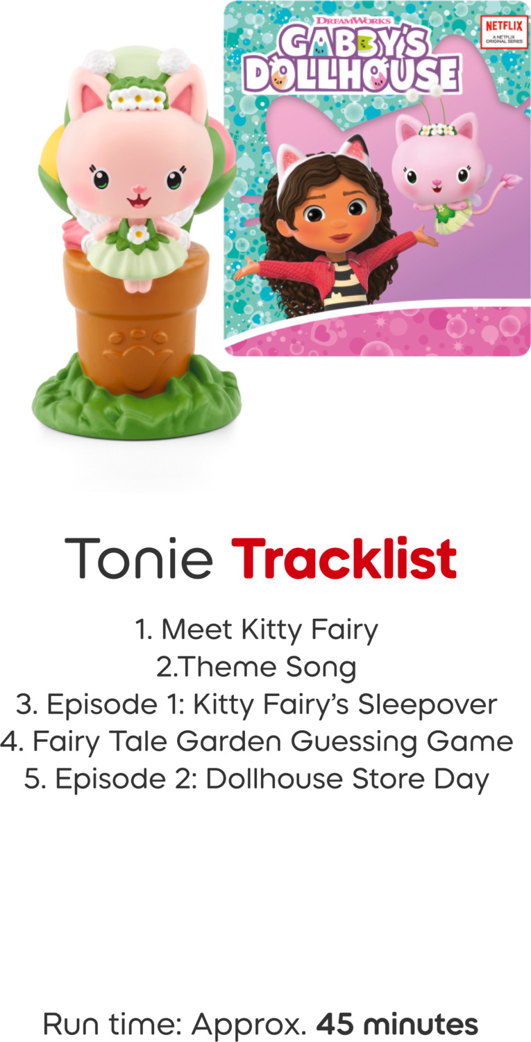 Join Gabby and Pandy for a magical sleepover in Kitty Fairy’s garden! Then travel around the dollhouse to earn kitty coins to use at DJ Catnip’s grand opening of his Music Store. This enchanting adventure teaches listeners about the joy of trying new things, the power of teamwork, and the importance of helping friends, all with a sprinkle of fairy dust!