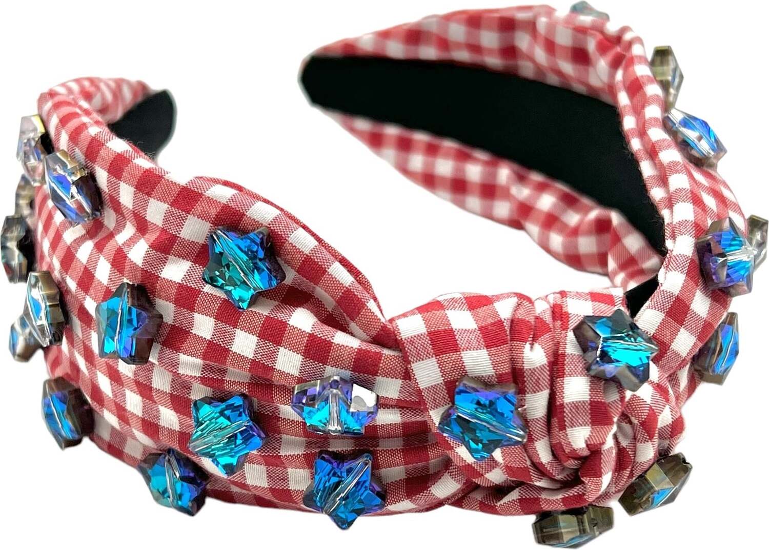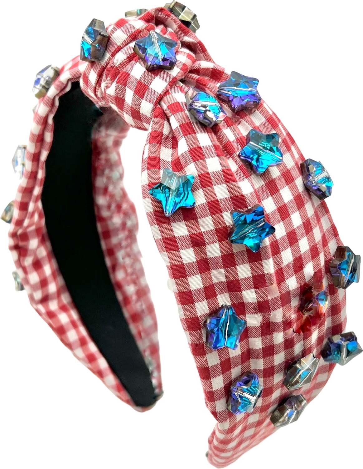 These are a brand new item! These are the latest trend in fashion headbands! This is an adorable red gingham knot headband that is adorned with blue star crystal rhinestones!