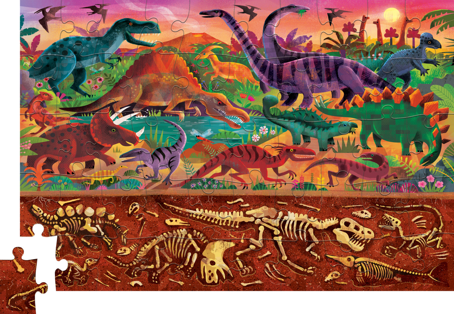 Sparkly delight! Discover the prehistoric world of dinosaurs with this 50-piece holographic puzzle! Bring the adventure to life with dazzling foil accents and vibrant, detailed illustrations of beetles, butterflies, and busy critters while developing puzzle-solving skills and hand-eye coordination. Crafted with high-quality blue board and soy-based inks, this puzzle will amaze and delight for years to come.