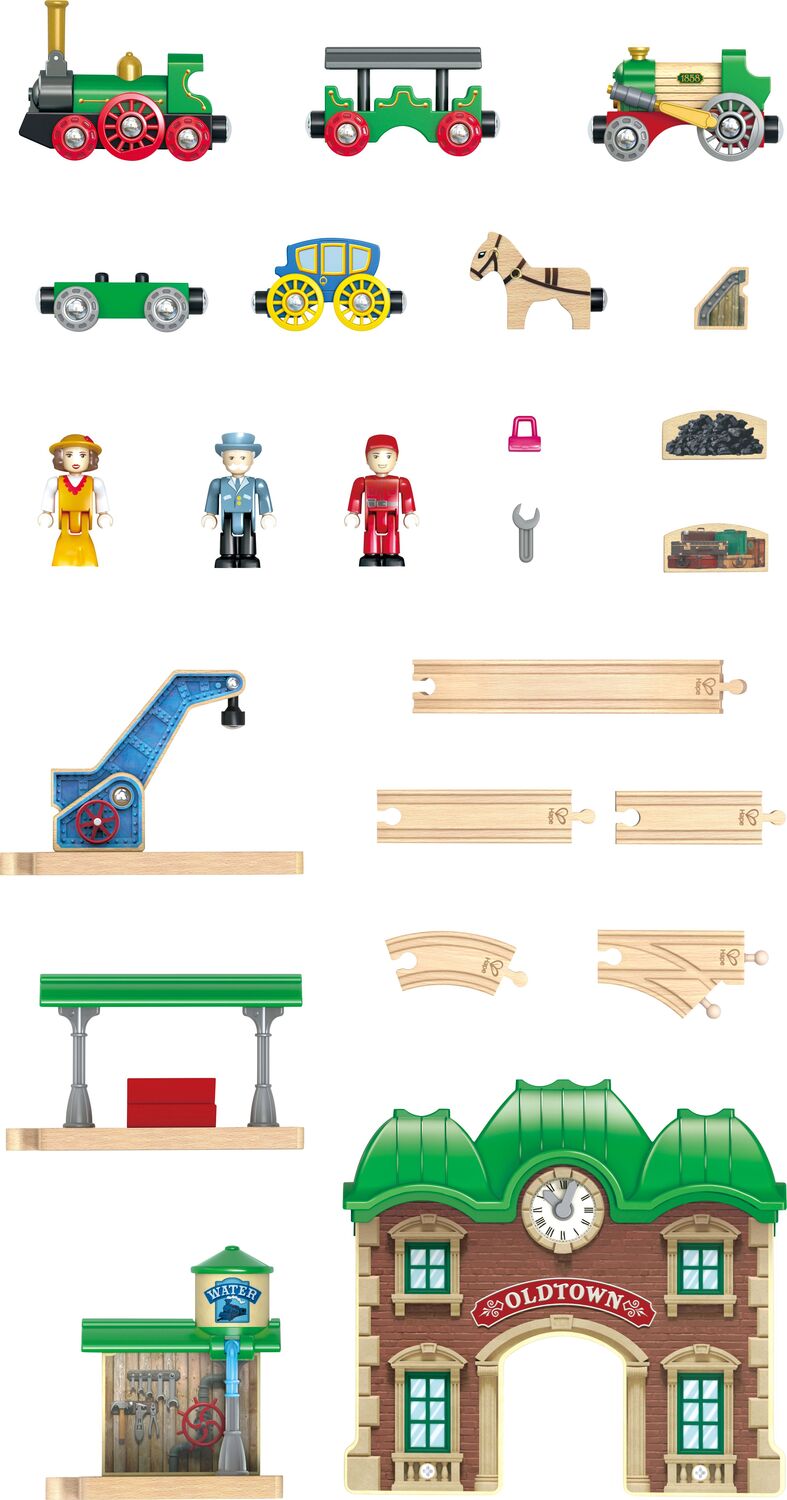 6 x 4" tracks, 2x 6" tracks, 1x Y track, 11x small curved tracks, 2x wooden sloped tracks, 1 horse, 1 cart, 2 free-wheel locomotives, 2 train cars, 1 station, 3 figures, 2 tools, 2 cargoes, 1 stop track, 1 crane, 1 water filling station, 1 platform